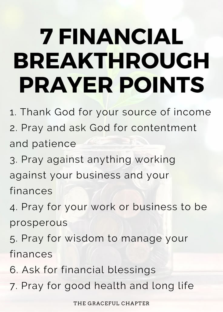 The 7 financial breakthrough prayer points are specific areas of focus that individuals can pray about to seek blessings and favor in their financial situation. These points often include prayers for wisdom in managing finances, guidance in making financial decisions, clarity in setting financial goals, increase in income opportunities, protection from financial troubles, gratitude for current blessings, and faith in God’s provision.
